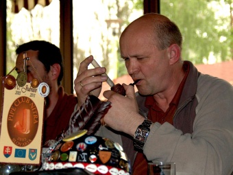 Když jsme s Daliborem vyhodnocovali naše „úspěchy“ na letošní domácí kuřácké soutěži, rozhodli jsme se, že se v klidu utajení vrhneme s plnou intenzitou do příprav na Mistrovství Slovenska. V loňském roce jsme se poprvé zúčastnili a soutěž jsme si téměř zamilovali. Příjemné prostředí, pohodoví a známí kolegové, skvělá obsluha s nabídkou chutných poživatin, přiměřený počet účastníků a kvalitní soutěžní dýmka. Co víc si přát na začátek května. A také naprosto ideální soutěž pro naše průlomové kouření. Pardon, nikoliv kouření, ale udržování uhlíku v hlavičce při životě, neboť pokud chcete pokořit uhlíkové šamany, musíte se věnovat uhlíku a nikoliv vlastnímu – klasickému - kouření. Princip je v podstatě velmi jednoduchý, ba přímo triviální. Zde je: Při soutěžním zapálení se nezapaluje celý povrch hlavičky, ale pouze se „bodne“ kraj hlavičky, kde se vytvoří uhlík. Je důležité nepřehnat plamen a nesežehnout celou hlavičku, nebo neudělat malý, z větší výšky. V prvním případě byste se pak museli namáhat s hledáním uhlíku pod popílkovým příkrovem. Ve druhém případě byste v soutěži skončili… Pokud máte správně „nabodnut“ uhlík, je důležitých prvních 10-15 min. abyste se „nehádali“ s ta- bákem, ale sžili se s ním. Uhlík udržovat na očích a pomocí dusátka si jej posouvat v hlavičce. Důležité je stále sledovat uhlík a v podstatě jemně přibafávat, resp. připukávat, když vidíte, že vyhasíná. Ale opravdu jen jemný tah, aby se uhlík rozhořel jen tak akorát a mohli jste jej přidusáním ťapťátkem postrčit. Prostě bafáte podle stavu uhlíku. Proto ho musíte mít na očích. Navíc, optimální hoření uhlíku způsobuje malou tvorbu popelu, kterou stačíte odstraňovat jemným „přilepním“ k ťapťátku a otřením o papír. Ovšem vlastní kouření je až na konci celé přípravy. Prvními kroky byl odhad soutěžního tabáku a rozměry soutěžní dýmky. U dýmky jsme vycházeli z loňského modelu a předpokládali, že Honza Klouček vyrobí typ se stejnými vnitřními parametry hlavičky, tj. vnitřní výška cca 35 mm a šířka cca 20 mm. A tabák? Určitě bude aromatik, ale jaké značky? Díky našim přátelům z kuřáckých luhů a hájů jsme odhadli Holger Danske Original Honey Dew – zlatá virginie ze Severní Karolíny a Zimbabwe, doplněná tureckým tabákem s chemickým přičmouděním po medu, v řezu loose cut. Takže kyprý řez a dalo se - s ohledem na parametry hlavičky - předpokládat její plné zaplnění a trošku náročnější skládání tabáku do hlavičky. Navíc loose cut velmi rychle hoří, takže potřebuje hodně péče. Po technické přípravě a obstarání tabáku mohl začít vlastní trénink. I když kolegové na Admiralitě nebyli příliš nadšení tím, že téměř denně vyuzujeme prostory a pokud za námi dojdou, ani se s nimi moc nebavíme a furt čučíme do hlavičky. Ale po 14-ti dnech se začaly projevovat první výsledky a časy neklesly pod hodinu!! Začínal nám narůstat optimismus do takové míry, že jsme ještě na poslední chvíli zvažovali účast na Klání v Olomouci, ale při pohledu na soutěžní dýmku, jsme od toho záměru rychle upustili. A pak přišel den D – 1. květen. Rodina Kramplů mě přibalila do vozidla a mohli jsme vyrazit směr Vlárský průsmyk a pak na jih směr Bratislava, Slovenský Grob (úžasná vesnice s husacinou skoro v každém druhém domě), k Vajnorům, kde jsme vyložili nekuřáckou část rodiny a naložili Daliborova švagra Michala. Přiznám se, že mně bylo Michala trochu líto. S kouřením dýmky nemá ještě mnoho soutěžních zkušeností a kdyby tušil, s kým si přisedl do auta, jak jsme s Daliborem „nabušení“, asi by jeho elán notně ochladl. Ale v dobré náladě jsme dorazili do Motelu M Malacky, vplynuli do velmi příjemných prostor, vítali se se známými, debatovali, drbali bernardýna, dávali si Zlatého bažanta s divinou, prohlíželi dýmky k prodeji, ceny, baštili škvarkové koláčky a bylo nám dobře. A pak konečně přišel ten okamžik, na který jsme se těšili. Start soutěže. U stolu jsme seděli sami 3, takže jsme se naplno mohli věnovat dýmce. Vedle nás další uhlíkáři ze Zlína s Michalem Hubaczem a přes uličku silný dýmka.net v čele s Pištou Germanem a Honzou Kloučkem. Mimochodem, Pištu jsem skoro vůbec nepoznal, neb zvolil design pro své vlasy ve stylu Geronimo. První cíl byl vydržet 30 mim., abychom nekouřili hůř, než bernardýn Julek. A šlo to vcelku v pohodě. „Nabodnutí“ hlavičky ok, tabák takový, jaký jsme čekali, prostě paráda. Uběhla půlhoďka, z hlavičky zmizela ani ne 1/3 náplně a svět vypadal nádherně. Ovšem za 5 min. přišlo to, co jsme nikdo nečekali. Naráz vstoupil do místnosti číšník ze sousedního výčepu, přičemž otevřel dveře dokořán a zároveň někdo otevřel doširoka druhé dveře ven. Místností proletěl průvan rychlostí japonského rychlovlaku. Uhlík se rozpálil jako meteor v hustých vrstvách atmosféry. Než jsme se stačili ozvat, dveře se zavřely a meteor zhasl. Vzápětí zvedl ruku Tibor, Dalibor, já a bylo hotovo. Jen jsme se na sebe s Daliborem podívali. Takže jsme začali povzbuzovat Michala, který klasickým kouřením dýmky bafkal a bafkal, až se probafkal na 6.místo celkově a 3. mezi dýmkaři ze Slovenska. Myslím si, že kolegům na Slovensku v něm roste vynikající dýmkař. Do poslední trojky se probojovali uhlíkáři Pišta s Honzou Kloučkem a mezi ně se vlomil klasik Igor Escher z PC Nitra. Poté, co Honza skončil, Igor skvěle vzdoroval, ale Pišta je Pišta. Takže průlom se nekonal a s Daliborem jsme meditovali, zda dál honit uhlík anebo bafat fajku, jak třeba bafají v její koléb