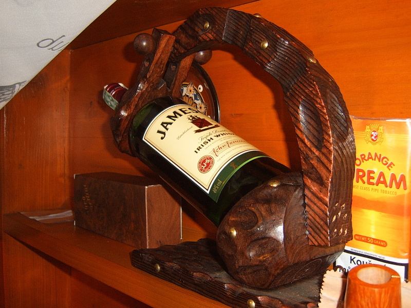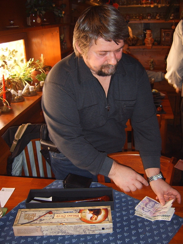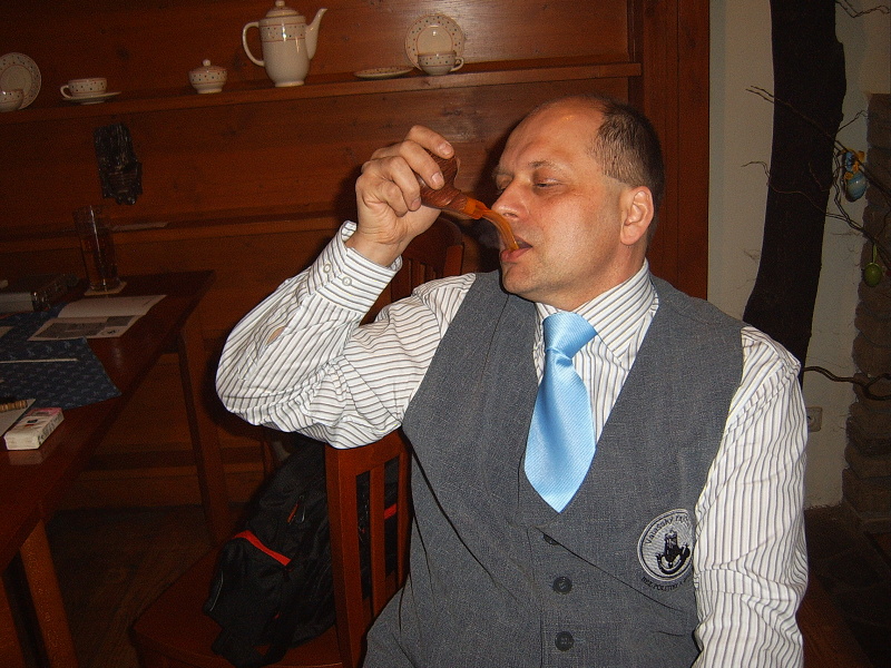 A teď už k vlastní soutěži. Sešlo se nás jako obvykle mezi třiceti a čtyřiceti, ze všech koutů Moravy a Slezska, tentokrát pouze muži. K nejvzdálenějším účastníkům jako vždy patřil bard dýmkařských soutěží hradecký Přemek Omrt a reprezentant Společnosti Sherlocka Holmese, prostějovský Alpenstock. Ceny do soutěže dodali donátoři, kterých si stále velice vážíme, dýmku pro vítěze daroval místostarosta Jirka Pernický, který se tohoto sponzoringu ujal po změně na meziříčské radnici - starosta je nekuřák :-). Bohužel zahraniční cesta nedovolila Jirkovi zúčastnit se soutěže. Další dýmky dodal Michal Hubacz z eTrafiky.cz, díky moc. Soutěžní tabáky a několik dýmeček poněkud tajemné značky Zoppo věnovala firma Mostex. A dále děkujeme panu Grafovi, jehož společnost zde nesmíme příliš propagovat - však vy-víte-proč. A jestli nevíte, tak si ho vygooglujte :-). A samozřejmě patří poděkováním robkám z Koliby, jak za láhev Jamesona, kterým přispěly do cen, tak za celodenní péči kterou nám věnovaly. Po úvodním fojtově proslovu všichni nacpali, úspěšně dvěma sirkami zapálili a začali kouřit jako sádroví ježci :-) I přes absenci dusátek odpadl první soutěžící až po dvaceti minutách. Bezdusátkový systém soutěže měl za následek první diskvalifikaci kterou jsme na soutěžích v tom to našem tak trochu zvláštním sportu zažili - kolega z PC5 z Rudy zcela automaticky sáhl po ťapťátku a začal šmrdlat tabák v hlavičce. Hlavní rozhodčí ho však svým na moři vytrénovaným bystrozrakem odhalil a dotyčný měl po ptákách :-) a po výsledku. Pro pobavení