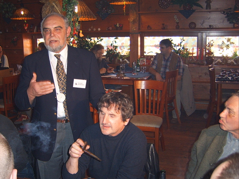 zahyne, přijde na řadu druhý v pořadí atd. Zpestřením soutěže bylo vyhlášení ceny za nejoriginálnější dusátko. Toto se nakonec zvrhlo ve vyhlášení hned čtyř cen, a to nejoriginálnější-nejveselejší-nejodvážnější-nejlépe zpracované :-) takže uvidíme co bude za rok. Opavský Jirka Zapletal byl viděn jak odhaduje výšku místnosti, takže se dá předpokládat, že příští rok si pro změnu někdo prolobuje kategorii "největší dusátko". Ještě jsem opomněl, před začátkem soutěže se v horním patře uskutečnilo zasedání prezídía ADK, v reprezentativní sestavě dvou prezidentů a jednoho fojta. Členská základna zatím nebyla o zásadních ujednáních prezídia podrobně informována, takže fčíl vlastně nevíme, co máme dělat. No co, budeme kouřit ty naše fajfky jako doteď. No a dole už vidíte zhodnocení akce, které provedli tři pozůstalí, fojt, nástěnkář a Garfield. Zhodnocení bylo provedeno nad studenou mísou, kterou věnovala paní šéfová, děkujeme. Jak jsme se doslechli, tak ještě jedno hodnocení provedli nezávisle na nás praporečník Lojza s Alpenstockem, kteří hodnotili až do pozdních večerních hodin, až z toho Alpenstock ztratil svou parádní hůl a v Olomouci na nádraží se pak ještě připletl do potyčky policie s fotbalovými rowdies :-)